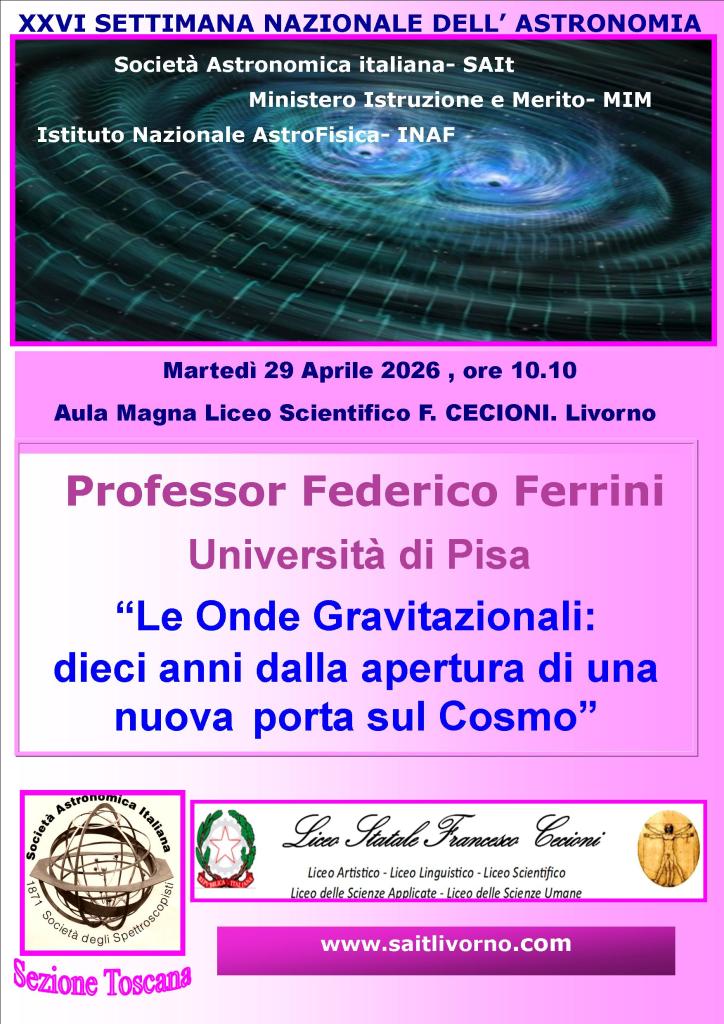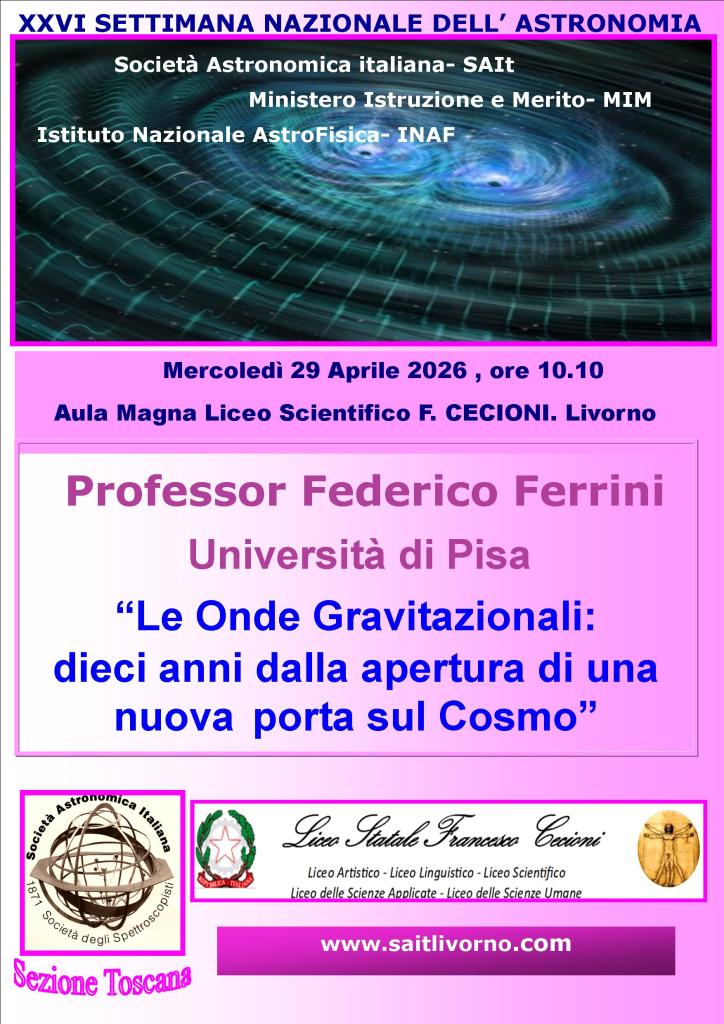 “Nel 1916 Albert Einstein pubblicò un articolo… in cui prevedeva l’esistenza di piccolissime increspature dello spazio-tempo generate da eventi cosmici estremi, le onde gravitazionali. Un secolo dopo, nel 2016, la collaborazione internazionale LIGO/Virgo annunciò la prima osservazione diretta di queste onde, durante due conferenze simultanee: negli Stati Uniti, a Washington, e in Italia, a Cascina (Pisa), nella sede dell’European Gravitational Observatory (EGO). Questa scoperta costituisce una pietra miliare nella storia della fisica … ed ha segnato l’inizio di un nuovo capitolo dell’astronomia …” (pubblicato sul sito nazionale della SAIt il 16 gennaio 2026) (www.sait.it)