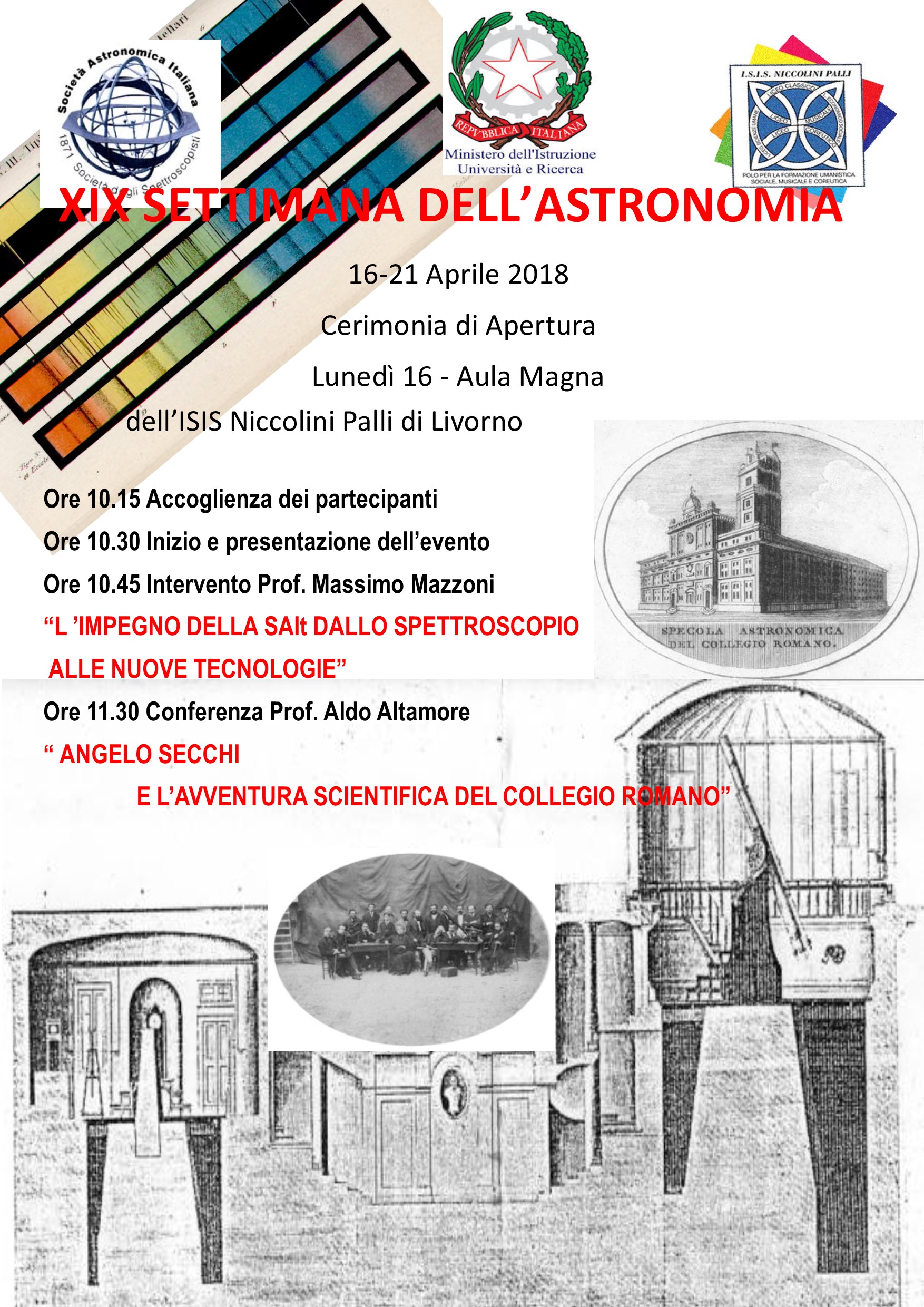 Si apre ufficialmente, in tutta Italia, lunedì 16 Aprile la settimana Nazionale dell’Astronomia promossa dalla Direzione Generale per gli Ordinamenti Scolastici e la Valutazione del Sistema Nazionale d’Istruzione del Ministero dell’Istruzione, dell’Università e della Ricerca. L’organizzazione è affidata alla Società Astronomica Italiana (SAIt), che opera in sinergia con l’Istituto Nazionale di Astrofisica (INAF.) La Settimana Nazionale dell’Astronomia è divenuta un appuntamento atteso e importante per le scuole italiane, invitate a diffondere tra i giovani la conoscenza del cielo e della ricerca astronomica, per motivarli e orientarli alla scoperta delle opportunità formative e professionali offerte dallo studio delle discipline scientifiche. La XIX edizione della Settimana Nazionale dell’Astronomia è dedicata a padre Angelo Secchi, il più grande astronomo italiano dell’800, in occasione del bicentenario della sua nascita.