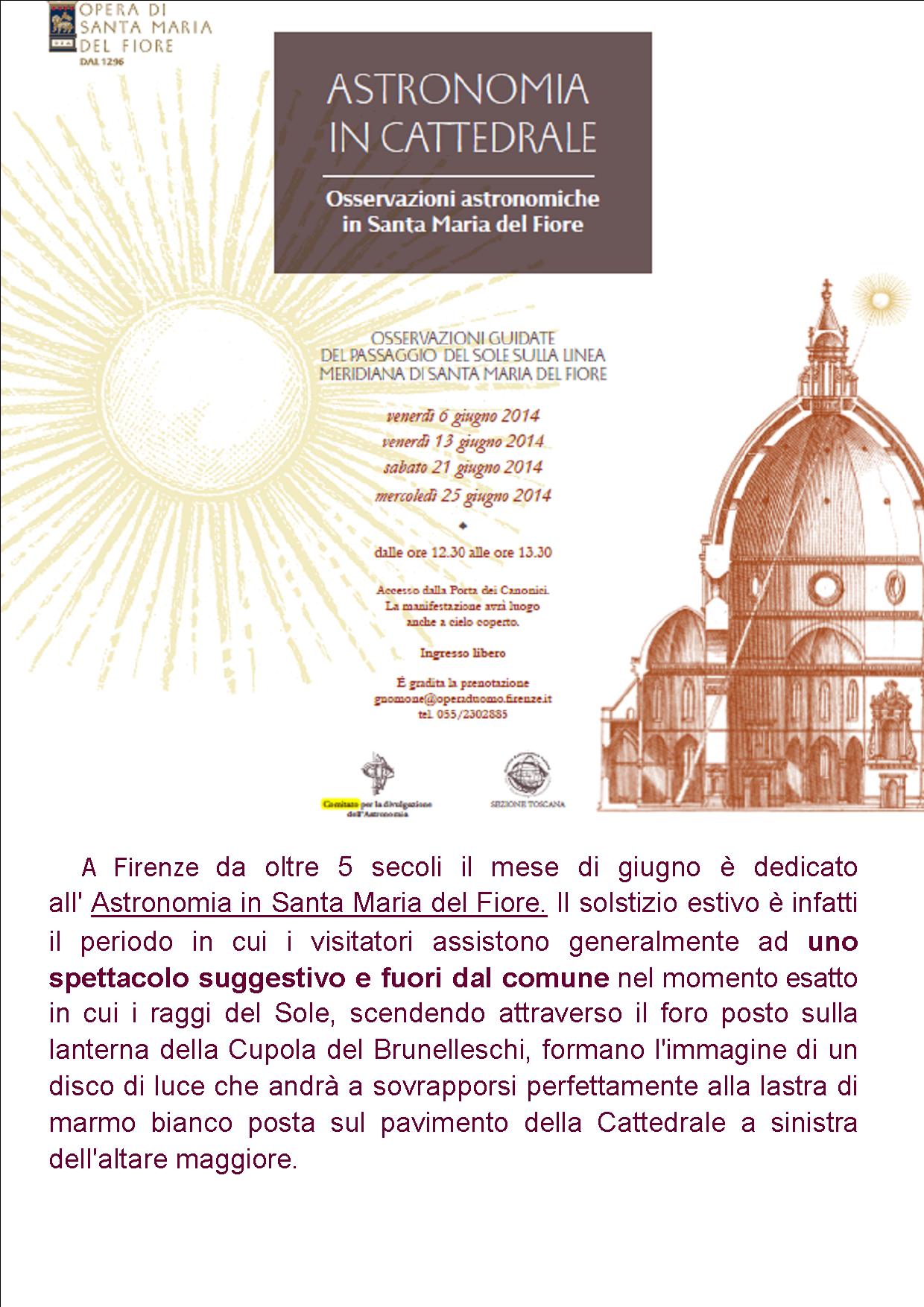 Il 21 giugno la SAIt- Toscana organizzerà una visita al Duomo di Firenze dove si assisterà attraverso l’apertura del foro gnomonico della cupola del Brunelleschi al passaggio dei raggi del Sole al solstizio d’estate.